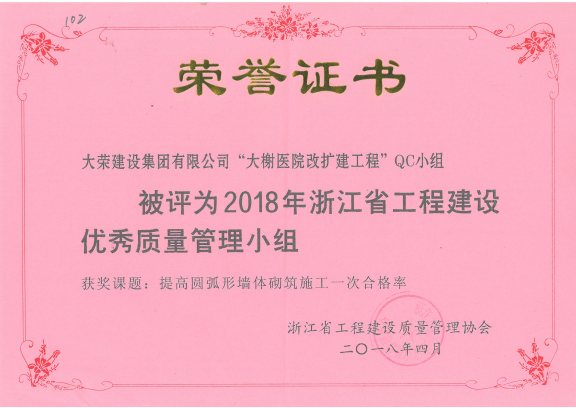 近日,由浙江省工程建设质量管理协会主办的《2018年浙江省工程建设优秀QC成果发布会》落下帷幕。经评选,我公司大榭医院改扩建工程QC小组荣获“2018年浙江省工程建设优秀质量管理小组”称号。