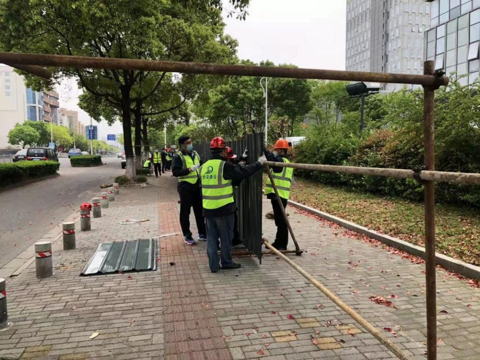 因疫情波及范围进一步扩大,按照街道抗疫工作部署,4日12日,抗疫任务的通知一经下达,党员抗疫应急小队成员纷纷主动请缨,要求到抗疫一线参与任务,“我报名”,“时刻准备着”,“我是黄码,核酸已做,还能参加任务吗?” 其中包括两鬓微霜的老党员,壮心不已,迎难而上,也坚定地站在疫情防控第一线,这充分展示了党员的先锋模范作用!4月13日清晨,党员抗疫应急小分队队员冒雨集结,赶赴慧和大厦进行围挡搭建工作。在现场,公司的两支应急小队在雨中有序进行接钢架、加固、设挡板,以最快的速度,合力完成慧和大厦周边区域近900米封挡工作,迅速有效阻断疫情传播渠道,筑牢疫情安全防线。